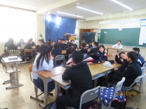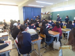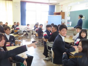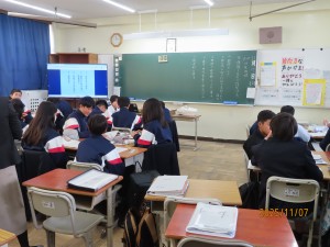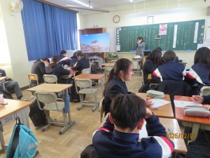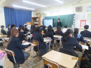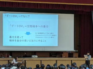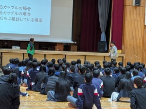 | 12月5日(金) 3年生 デートDV ドーン財団(大阪府男女共同参画推進財団)と岸和田市男女共同参画課の方々に来ていただきお話していただきました。3年生の先生方が、迫真の演技で寸劇をしてくれたので真剣に学んでいました。 |