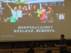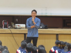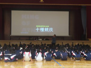 | 12月11日(木) 1年生 人権学習 10種競技選手でn「脳腫瘍アスリート」の壇野 俊さんに、来ていただきました。最初は身体全体を使ったアイスブレーキングを楽しみ、その後、ご自身のアスリート人生の中で脳腫瘍の摘出手術後の後遺症を乗り越えてきた経験をお話いただきました。 |