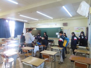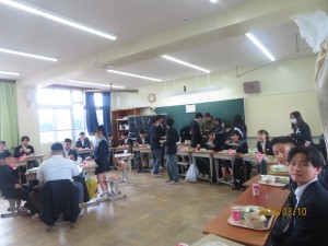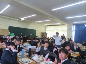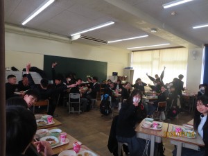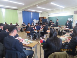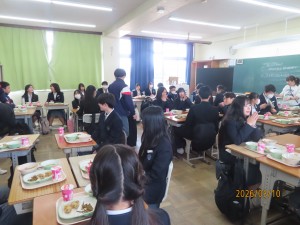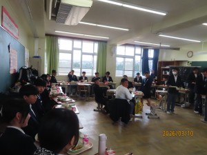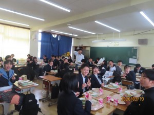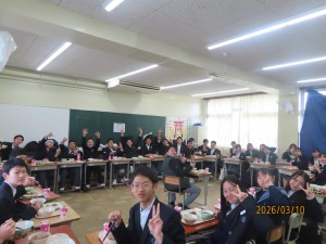 | 3年生最後の給食 クラスで思い思いの形で食べています。5・6限は3年生を送る会で、生徒会の代表が贈る言葉を捧げました。 |