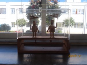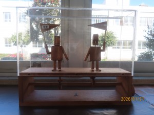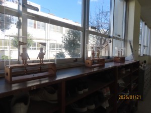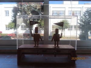 | 1月21日(水) 校務員の中村さんが職員室前の下足箱の上に、3学年分の掲示板を兼ねた動くモニュメントを制作して下さいました。それぞれ「自主」「敬愛」「健康」の旗を掲げ、笑顔で話しかけてくれるように動きます。 |