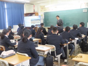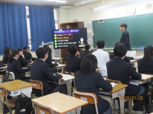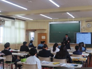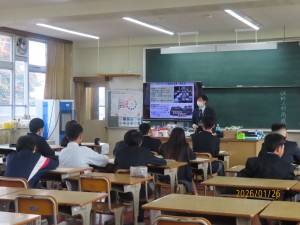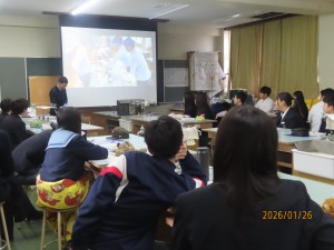 | 1月26日(月) 2年生 進路講話 岸和田市立産業高等学校をはじめ、府立は和泉、貝塚、岸和田、久米田、佐野工科、伯太高校の6校、私立は近畿大学泉州高等学校、羽衣学園高等学校、浪速高等学校の3校合計10校の先生方に来ていただき、生徒は各自3校の説明を聞きました。それぞれの高校の特色や行事、カリキュラムや卒業後の進路状況についてお話していただきました。 |