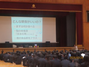 | 2年生 食育 給食センターから栄養士の先生に来ていただき、体に必要な栄養素や無理なダイエットをしないようにお話してくださいました。 |
