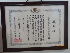| 2月24日(火) 法務省人権擁護局と全国人権擁護委員連合会より、桜台中学校の人権作文コンテストへの取り組みを表彰していただきました。 |