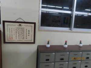 | 職員室校舎入口に地域の方が生け花を生けてくださいます。花台は校務員さんが新しく制作してくれました。 |