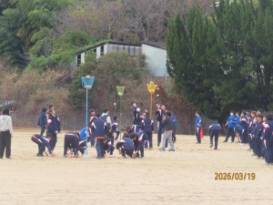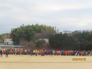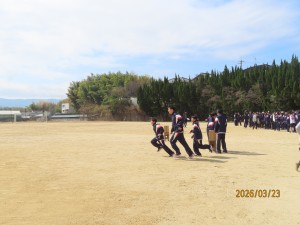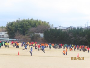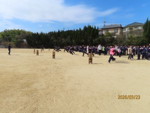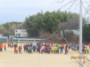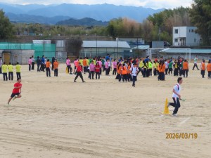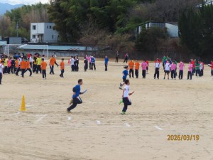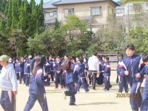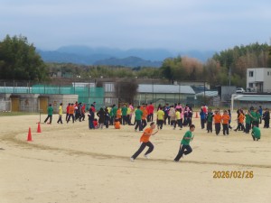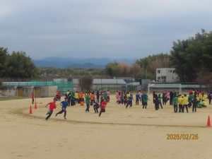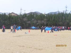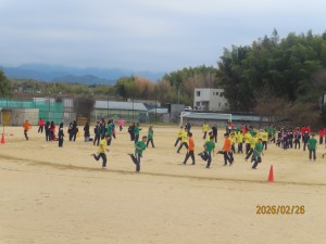 | 2月26日(木) 3年生 最後のクラスマッチ 1年のクラスで綱引き、2年のクラスでドッジボール、3年のクラスで全員リレー、最後は常盤校区対光明校区の綱引きに全力で取り組みました。 |