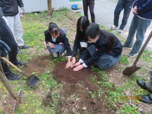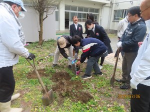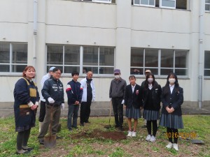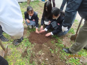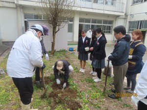 | 3月2日(月) 被爆アオギリの植樹 生徒会執行部と地域のボランティアのみなさんと一緒に、広島市から贈られた平和を願う被爆アオギリを植樹しました。 |