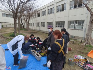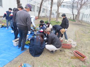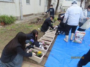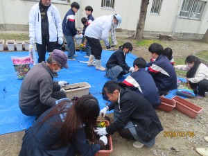 | 地域のボランティアのみなさんと美化委員会のみなさんが卒業式に向けて、パンジーなどプランターに花を植えてくれました。 |