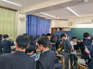 | 6月2日(月) 2年生「SDGsラジオ」を運営している株式会社ケシオンより3名の講師の方に来ていただき、出前授業をしていただきました。SDGsの中で自分で課題を決めて、ラジオを聞いて情報収集し、整理して謎解き問題を作ったり、SDGsの取り組みをいている会社と協力してどんなことができるかアイデアを意見交換しました。 |